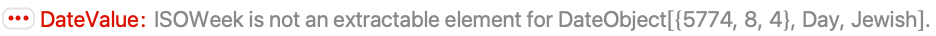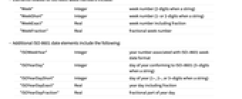 "Week" Integer week number (2‐digits when a string) "WeekShort" Integer week number (1‐ or 2‐digits when a string) "WeekExact" Real week number including fraction "WeekFraction" Real fractional week number - Additional ISO-8601 date elements include the following: