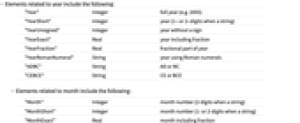 "Year" Integer full year (e.g. 2005) "YearShort" Integer year (1- or 2-digits when a string) "YearUnsigned" Integer year without a sign "YearExact" Real year including fraction "YearFraction" Real fractional part of year "YearRomanNumeral" String year using Roman numerals "ADBC" String AD or BC "CEBCE" String CE or BCE - Elements related to month include the following: