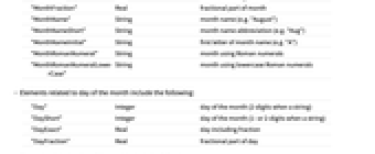 "Month" Integer month number (2‐digits when a string) "MonthShort" Integer month number (1‐ or 2‐digits when a string) "MonthExact" Real month including fraction "MonthFraction" Real fractional part of month "MonthName" String month name (e.g. "August") "MonthNameShort" String month name abbreviation (e.g. "Aug") "MonthNameInitial" String first letter of month name (e.g. "A") "MonthRomanNumeral" String month using Roman numerals "MonthRomanNumeralLowerCase" String month using lowercase Roman numerals - Elements related to day of the month include the following: