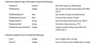 "DayName" Symbol day of the week (e.g. Wednesday) "ISOWeekDay" Integer day number of week conforming to ISO-8601 (e.g. 3) "ISOWeekDayExact" Real day number of week including fraction "ISOWeekDayFraction" Real fractional day number of week "DayNameShort" String day of the week abbreviation (e.g. "Wed") "DayNameInitial" String first letter of day name (e.g. "W") "DayNameInstanceInMonth" Integer instance number of day name within the month (e.g. 2) - Elements related to hour include the following: