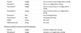 "Hour" Integer hour (2‐digits when a string) "Hour12" Integer hour on 12‐hour clock (2‐digits when a string) "Hour24" Integer hour on 24‐hour clock (2‐digits when a string) "HourShort" Integer hour (1‐ or 2‐digits when a string) "Hour12Short" Integer hour on 12‐hour clock (1‐ or 2‐digits when a string) "Hour24Short" Integer hour on 24‐hour clock (1‐ or 2‐digits when a string) "HourExact" Real hour including fraction "HourFraction" Real fractional part of hour "AMPM" String AM or PM "AMPMLowerCase" String am or pm - Elements related to minute include the following: