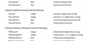 "Second" Integer seconds (2-digits when a string) "SecondShort" Integer seconds (1‐ or 2‐digits when a string) "SecondExact" Real seconds including fractional seconds "SecondFraction" Real fractional part of seconds - Elements related to millisecond include the following: