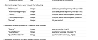 "Millennium" Integer 1000 year period beginning with year XX00 "MillenniumBeginning01" Integer 1000 year period beginning with year XX01 "Century" Integer 100 year period beginning with year XX00 "CenturyBeginning01" Integer 100 year period beginning with year XX01 "Decade" Integer 10 year period - Elements related quarters of a calendar year include: