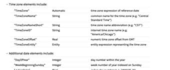 "TimeZone" Automatic time zone expression of reference date "TimeZoneName" String common name for the time zone (e.g. "Central Standard Time") "TimeZoneNameShort" String time zone name abbreviation (e.g. "CST") "TimeZoneID" String internet time zone name (e.g. "America/Chicago") "TimeZoneOffset" Real numeric time zone offset from GMT "TimeZoneEntity" Entity entity expression representing the time zone - Additional date elements include: