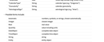Automatic numbers, symbols, or strings, chosen automatically Integer closest integer Real real value Quantity value including units DateObject complete date object TimeObject complete time object String string Entity entity object - In DateValue[date,elem,form], some form specifications may not be supported in all elements elem.