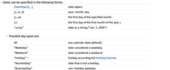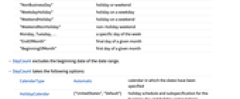 All any calendar date (default) "Weekday" date considered a weekday "Weekend" date considered a weekend "Holiday" holiday according the HolidayCalendar "NonHoliday" date that is not a holiday "BusinessDay" non-holiday weekday "NonBusinessDay" holiday or weekend "WeekdayHoliday" holiday on a weekday "WeekendHoliday" holiday on a weekend "WeekendNonHoliday" non-holiday weekend Monday, Tuesday, … a specific day of the week "EndOfMonth" final day of a given month "BeginningOfMonth" first day of a given month - DayCount excludes the beginning date of the date range.
