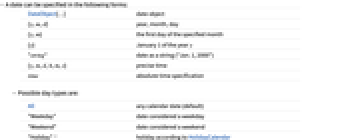 DateObject[…] date object {y,m,d} year, month, day {y,m} the first day of the specified month {y} January 1 of the year y "string" date as a string ("Jan. 1, 2000") {y,m,d,h,m,s} precise time time absolute time specification - Possible day types are: