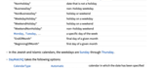 All any calendar date (default) "Weekday" date considered a weekday "Weekend" date considered a weekend "Holiday" holiday according to HolidayCalendar "NonHoliday" date that is not a holiday "BusinessDay" non-holiday weekday "NonBusinessDay" holiday or weekend "WeekdayHoliday" holiday on a weekday "WeekendHoliday" holiday on a weekend "WeekendNonHoliday" non-holiday weekend Monday, Tuesday, … a specific day of the week "EndOfMonth" final day of a given month "BeginningOfMonth" first day of a given month - In the Jewish and Islamic calendars, the weekdays are Sunday through Thursday.