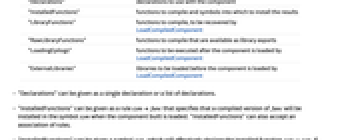 "Declarations" declarations to use with the component "InstalledFunctions" functions to compile and symbols into which to install the results "LibraryFunctions" functions to compile, to be recovered by LoadCompiledComponent "RawLibraryFunctions" functions to compile that are available as library exports "LoadingEpilogs" functions to be executed after the component is loaded by LoadCompiledComponent "ExternalLibraries" libraries to be loaded before the component is loaded by LoadCompiledComponent - "Declarations" can be given as a single declaration or a list of declarations.