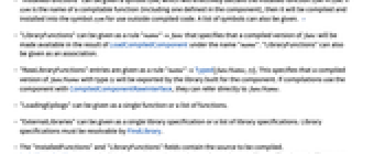 - "RawLibraryFunctions" entries are given as a rule "name"Typed[funcName,ty]. This specifies that a compiled version of funcName with type ty will be exported by the library built for the component. If compilations use the component with CompiledComponentRawInterface, they can refer directly to funcName.
