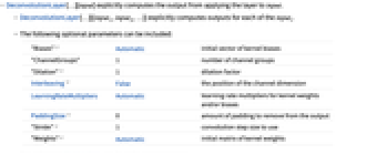 are the padding sizes at the beginning/end of the axis, k is the kernel size, and s is the stride size for each dimension. - Options[DeconvolutionLayer] gives the list of default options to construct the layer. Options[DeconvolutionLayer[…]] gives the list of default options to evaluate the layer on some data.