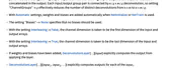 group of output channels, and results are concatenated in the output. Each input/output group pair is connected by n/g×m/g deconvolution, so setting "ChannelGroups"g effectively reduces the number of distinct deconvolutions from n×m to n×m/g. - With Automatic settings, weights and biases are added automatically when NetInitialize or NetTrain is used.