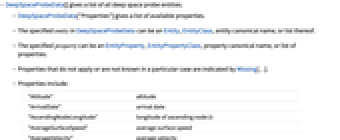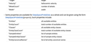 "Entities" all available entities "EntityCount" total number of available entities "Classes" all available entity classes "EntityClassCount" total number of available entity classes "SampleEntities" list of sample entities "SampleEntityClasses" list of sample entity classes "EntityCanonicalNames" list of all entity canonical names "PropertyCanonicalNames" list of all property canonical names "EntityClassCanonicalNames" list of all entity class canonical names "RandomEntities" pseudorandom sample entities {"RandomEntities",n} n pseudorandom entities "RandomEntityClasses" pseudorandom sample entity classes {"RandomEntityClasses",n} n pseudorandom entity classes - The following annotations can be used in the third argument of DeepSpaceProbeData[entity,property,annotation]: