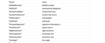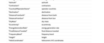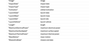 "AverageSurfaceSpeed" average surface speed "AverageVelocity" average velocity "Azimuth" azimuth "Contractors" contractors "CountryOfOperatorOwner" operator countries "Declination" declination "DistanceFromEarth" distance from Earth "DistanceFromSun" distance from Sun "DryMass" dry mass "Eccentricity" eccentricity "EnergyGenerationRate" energy generation rate "FinalDistanceTraveled" final distance traveled "FrequencyBand" frequency band "Height" height "HelioCoordinates" heliocentric XYZ coordinates "Image" image "ImpactDate" impact date "ImpactType" impact type "Inclination" orbital inclination "LaunchDate" launch date "LaunchMass" launch mass "LaunchSite" launch site "LaunchVehicle" launch vehicle "Length" length "MaximumElectricalPower" maximum electrical power "MaximumSurfaceSpeed" maximum surface speed "MaximumThermalPower" maximum thermal power "MeanMotion" mean motion "MissionEndDate" mission end date "Name" name "NORADNumber" NORAD number "NSSDCID" international designator "NuclearFuelMass" nuclear fuel mass "NuclearFuelSource" nuclear fuel source "OrbitGraphic" orbit graphic "OrbitPath" orbit path "PeriapsisArgument" argument of periapsis