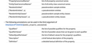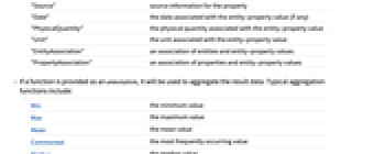 "Qualifiers" the list of possible qualifiers for the property "QualifierValues" the list of possible values that can be given to each qualifier "DefaultQualifierValues" the list of default values for the property's qualifiers "Description" a brief textual description of the property "Definition" a detailed textual definition of the property "Source" source information for the property "Date" the date associated with the entity-property value (if any) "PhysicalQuantity" the physical quantity associated with the entity-property value "Unit" the unit associated with the entity-property value "EntityAssociation" an association of entities and entity-property values "PropertyAssociation" an association of properties and entity-property values - If a function is provided as an annotation, it will be used to aggregate the result data. Typical aggregation functions include: