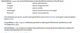 - Using DiffStyle<|keyspec|> is effectively equivalent to replacing the diff elements specified by key with Style[diffelement,spec].