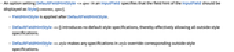 - An option setting DefaultFieldHintStyle->spec in an InputField specifies that the field hint of the InputField should be displayed as Style[contents,spec].