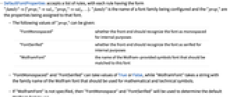 - DefaultFontProperties accepts a list of rules, with each rule having the form "family"{"prop1"val1,"prop2"val2,…}. "family" is the name of a font family being configured and the "propi" are the properties being assigned to that font.