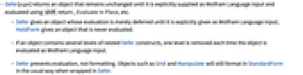 - Defer[expr] returns an object that remains unchanged until it is explicitly supplied as Wolfram Language input and evaluated using
