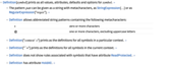 * zero or more characters @ one or more characters, excluding uppercase letters - Definition["context`*"] prints as the definitions for all symbols in a particular context. »