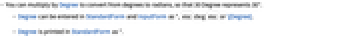 - You can multiply by Degree to convert from degrees to radians, so that 30Degree represents 30°.