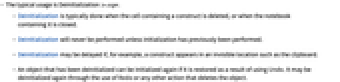 - Deinitialization is typically done when the cell containing a construct is deleted, or when the notebook containing it is closed.