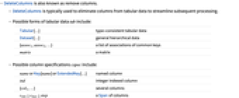 - DeleteColumns is typically used to eliminate columns from tabular data to streamline subsequent processing.