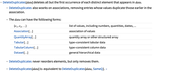 {e1,e2,…} list of values, including numbers, quantities, dates, ... Association[…] association of values QuantityArray[…] quantity array or other structured array Tabular[…] type-consistent tabular data TabularColumn[…] type-consistent column data Dataset[…] general hierarchical data - DeleteDuplicates never reorders elements, but only removes them.