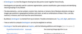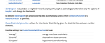 ClusterDissimilarityFunction Automatic the clustering linkage algorithm to use DistanceFunction Automatic the distance or dissimilarity to use FeatureExtractor Automatic how to extract features from data - Dendrogram evaluated on a weighted tree only displays the graph as a dendrogram, therefore only the options of Graphics will change the final result.