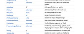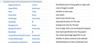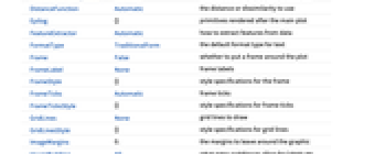 AlignmentPoint Center the default point in the graphic to align with AspectRatio Automatic ratio of height to width Axes False whether to draw axes AxesLabel None axes labels AxesOrigin Automatic where axes should cross AxesStyle {} style specifications for the axes Background None background color for the plot BaselinePosition Automatic how to align with a surrounding text baseline BaseStyle {} base style specifications for the graphic ClusterDissimilarityFunction Automatic the clustering linkage algorithm to use ContentSelectable Automatic whether to allow contents to be selected CoordinatesToolOptions Automatic detailed behavior of the coordinates tool DistanceFunction Automatic the distance or dissimilarity to use Epilog {} primitives rendered after the main plot FeatureExtractor Automatic how to extract features from data FormatType TraditionalForm the default format type for text Frame False whether to put a frame around the plot FrameLabel None frame labels FrameStyle {} style specifications for the frame FrameTicks Automatic frame ticks FrameTicksStyle {} style specifications for frame ticks GridLines None grid lines to draw GridLinesStyle {} style specifications for grid lines ImageMargins 0. the margins to leave around the graphic ImagePadding All what extra padding to allow for labels etc. ImageSize Automatic the absolute size at which to render the graphic LabelStyle {} style specifications for labels Method Automatic details of graphics methods to use PlotLabel None an overall label for the plot PlotRange All range of values to include PlotRangeClipping False whether to clip at the plot range PlotRangePadding Automatic how much to pad the range of values PlotRegion Automatic the final display region to be filled PreserveImageOptions Automatic whether to preserve image options when displaying new versions of the same graphic Prolog {} primitives rendered before the main plot RotateLabel True whether to rotate y labels on the frame Ticks Automatic axes ticks TicksStyle {} style specifications for axes ticks