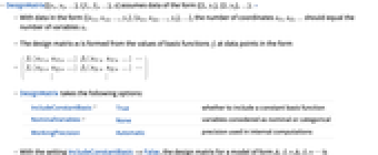 IncludeConstantBasis True whether to include a constant basis function NominalVariables None variables considered as nominal or categorical WorkingPrecision Automatic precision used in internal computations - With the setting IncludeConstantBasis->False, the design matrix for a model of form β1 f1+β2 f2+⋯ is constructed. »