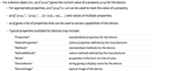 "Properties" standardized properties for the device "NativeProperties" native properties defined by the manufacturer "Methods" standardized methods for the device "NativeMethods" native methods defined by the manufacturer "Rules" properties in the form of a list of rules "DeviceName" string giving a display name for the device "DeviceImage" typical image of the device - Individual properties, as well as native properties, can usually be specified just by giving their names. In the case of a conflict, dev["NativeProperties","prop"] accesses a native property.