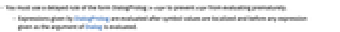 - Expressions given by DialogProlog are evaluated after symbol values are localized and before any expression given as the argument of Dialog is evaluated.