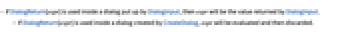 - If DialogReturn[expr] is used inside a dialog put up by DialogInput, then expr will be the value returned by DialogInput.
