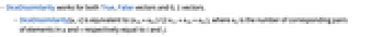 - DiceDissimilarity works for both True, False vectors and 0, 1 vectors.