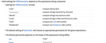 "Lists" compare lists by item "Characters" compare strings character by character "Words" compare strings one word at a time "Lines" compare strings or files one full line at a time "Cells" compare one Cell with another "Notebooks" compare one Notebook with another - The default setting of Automatic will choose an appropriate granularity for the given expressions.