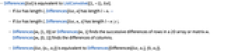 - Differences[m,{1,0}] or Differences[m,1] finds the successive differences of rows in a 2D array or matrix m. Differences[m,{0,1}] finds the differences of columns.