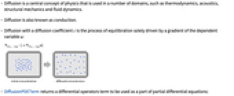 - Diffusion is a central concept of physics that is used in a number of domains, such as thermodynamics, acoustics, structural mechanics and fluid dynamics.