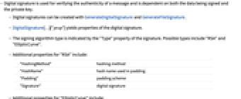 "HashingMethod" hashing method "HashName" hash name used in padding "Padding" padding scheme "Signature" digital signature - Additional properties for "EllipticCurve" include: