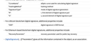 "CurveName" elliptic curve used for calculating digital signature "HashingMethod" hashing method "SignatureType" mode of digital signature generation "R" r, first element of digital signature pair "S" s, second element of digital signature pair - For a Bitcoin blockchain digital signature, additional properties include: