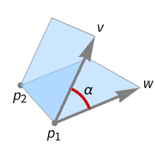 gives the angle between two half-planes bounded by the line through p1 and p2 and extended in the direction v and w.