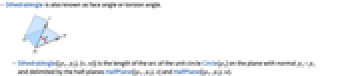 - DihedralAngle[{p1,p2},{v,w}] is the length of the arc of the unit circle Circle[p1] on the plane with normal p2-p1 and delimited by the half‐planes HalfPlane[{p1,p2},v] and HalfPlane[{p1,p2},w].