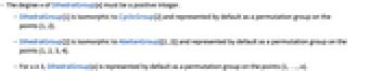 - For n≥3, DihedralGroup[n] is represented by default as a permutation group on the points {1,…,n}.