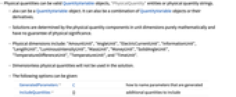 - Physical quantities can be valid QuantityVariable objects, "PhysicalQuantity" entities or physical quantity strings.