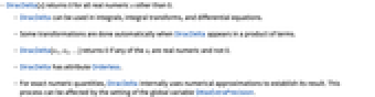 - For exact numeric quantities, DiracDelta internally uses numerical approximations to establish its result. This process can be affected by the setting of the global variable $MaxExtraPrecision.