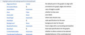 AlignmentPoint Center the default point in the graphic to align with AnnotationRules {} annotations for graph, edges and vertices AspectRatio Automatic ratio of height to width Axes False whether to draw axes AxesLabel None axes labels AxesOrigin Automatic where axes should cross AxesStyle {} style specifications for the axes Background None background color for the plot BaselinePosition Automatic how to align with a surrounding text baseline BaseStyle {} base style specifications for the graphic ContentSelectable Automatic whether to allow contents to be selected CoordinatesToolOptions Automatic detailed behavior of the coordinates tool DirectedEdges Automatic whether to interpret Rule as DirectedEdge EdgeLabels None labels and label placements for edges EdgeLabelStyle Automatic style to use for edge labels EdgeShapeFunction Automatic generate graphic shapes for edges EdgeStyle Automatic style used for edges EdgeWeight Automatic weights for edges Epilog {} primitives rendered after the main plot FormatType TraditionalForm the default format type for text Frame False whether to put a frame around the plot FrameLabel None frame labels FrameStyle {} style specifications for the frame FrameTicks Automatic frame ticks FrameTicksStyle {} style specifications for frame ticks GraphHighlight {} graph elements to highlight GraphHighlightStyle Automatic style for highlight GraphLayout Automatic how to lay out vertices and edges GridLines None grid lines to draw GridLinesStyle {} style specifications for grid lines ImageMargins 0. the margins to leave around the graphic ImagePadding All what extra padding to allow for labels etc. ImageSize Automatic the absolute size at which to render the graphic LabelStyle {} style specifications for labels Method Automatic details of graphics methods to use PerformanceGoal Automatic aspects of performance to try to optimize PlotLabel None an overall label for the plot PlotRange All range of values to include PlotRangeClipping False whether to clip at the plot range PlotRangePadding Automatic how much to pad the range of values PlotRegion Automatic the final display region to be filled PlotTheme $PlotTheme overall theme for the graph PreserveImageOptions Automatic whether to preserve image options when displaying new versions of the same graphic Prolog {} primitives rendered before the main plot RotateLabel True whether to rotate y labels on the frame Ticks Automatic axes ticks TicksStyle {} style specifications for axes ticks VertexCoordinates Automatic coordinates for vertices VertexLabels None labels and placements for vertices VertexLabelStyle Automatic style to use for vertex labels VertexShape Automatic graphic shape for vertices VertexShapeFunction Automatic generate graphic shapes for vertices VertexSize Medium size of vertices VertexStyle Automatic styles for vertices VertexWeight Automatic weights for vertices