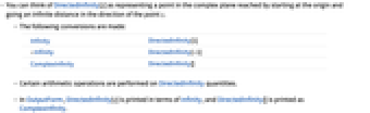 Infinity DirectedInfinity[1] -Infinity DirectedInfinity[-1] ComplexInfinity DirectedInfinity[] - Certain arithmetic operations are performed on DirectedInfinity quantities.