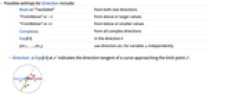 {dir1,…,dirn} use direction diri for variable xi independently - DirectionExp[ θ] at x* indicates the direction tangent of a curve approaching the limit point x*.