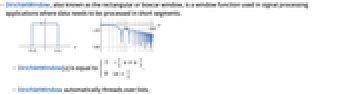 - DirichletWindow, also known as the rectangular or boxcar window, is a window function used in signal processing applications where data needs to be processed in short segments.
