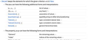 "Element" the remaining values » "Index" indices of the remaining values » "BitVectorMask" Boolean mask returning True for selected values and False otherwise » {prop1,prop2,…} a list of multiple forms » All an association giving element, index and bit vector mask » - Discard[crit][data] is equivalent to Discard[data,crit].